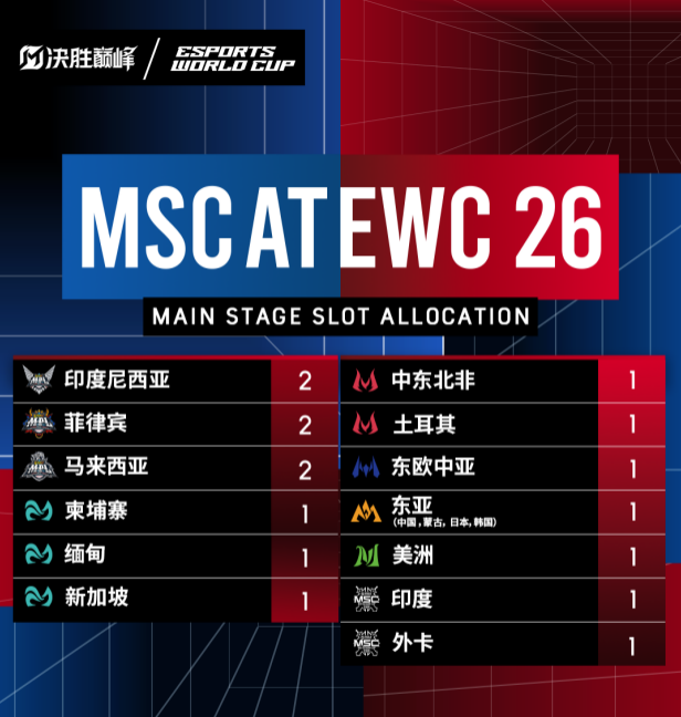 本次电竞世界杯MLBB赛事包含两大核心赛事板块。其中,MLBB全球季中杯(简称MSC)将汇聚全球25支顶尖战队,所有队伍均通过覆盖全球的职业和区域联赛的资格赛体系晋级。结合MLBB全新五大赛区(东南亚SEA、东欧中亚EECA、欧洲中东非洲EMEA、东亚EA、美洲AMER)规划,本届MSC设置了史上规模最大的外卡赛,共有10支队伍参赛,其中首次迎来西欧的队伍,进一步强化了各赛区的联动与融合。值得关注的是,印度队伍将首次登上MSC正赛舞台,成为MLBB扩大区域参与度的重要一步。