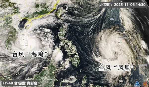11月6日下午,台风“海鸥”和“凤凰”卫星云图。