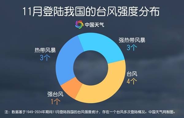 11月还有台风登陆我国,是否罕见?周丽贤表示,如果“凤凰”最终登陆我国,也不算罕见,常年一直到12月还会有台风登陆我国。中国天气网统计1949年至2024年台风大数据发现,常年11月,在此期间生成的台风有175个,但登陆我国的个数较少,仅有11个。从登陆强度来看,常年11月登陆我国的台风强度总体较强,近半数台风登陆时强度达台风及以上级别。