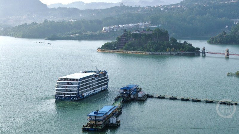一艘游轮准备靠泊在石宝寨旅游码头。