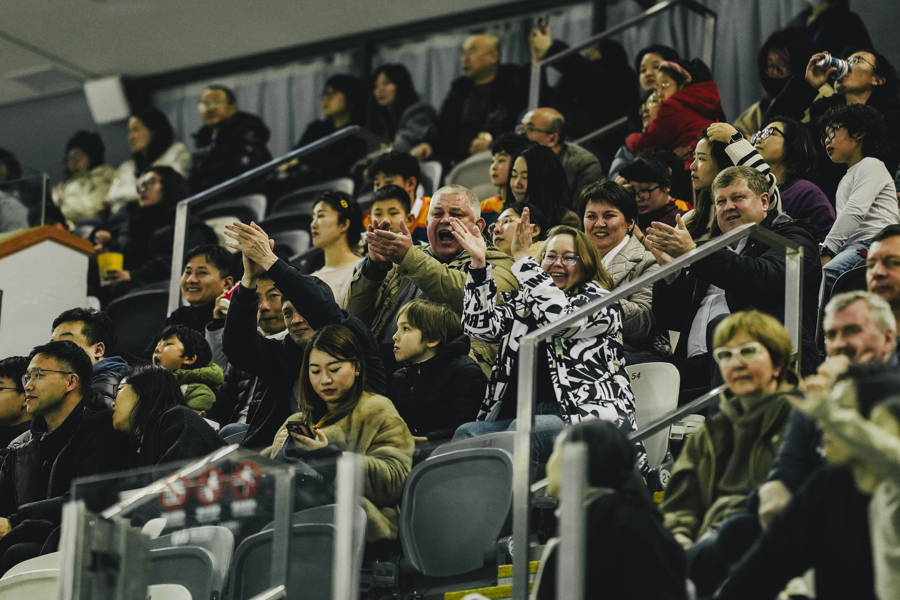 赛场内激战正酣,看台上同样热闹非凡,有许多带着孩子来观赛的家庭——孩子们穿着代表各自俱乐部的冰球服,眼神追随着冰面上疾驰的身影,不时发出惊叹。